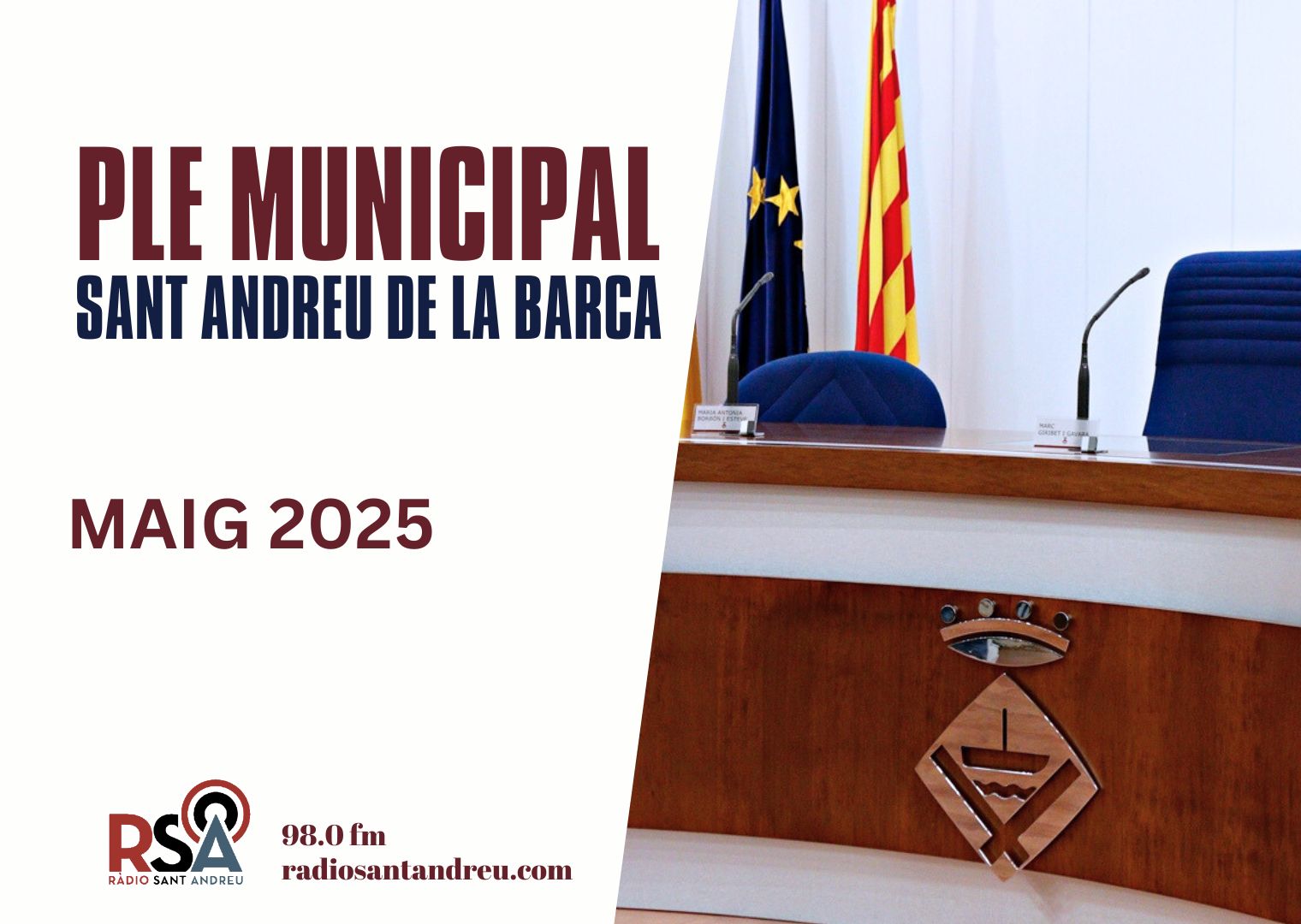 Ràdio Sant Andreu oferirà en directe el ple municipal aquest dijous 29 de maig a partir de les 19 h. I una hora abans, l’Audiència Pública.  Escolta-ho a www.radiosantandreu.com,  als 98.0 fm  i als dispositius intel·ligents de Google i Alexa.
